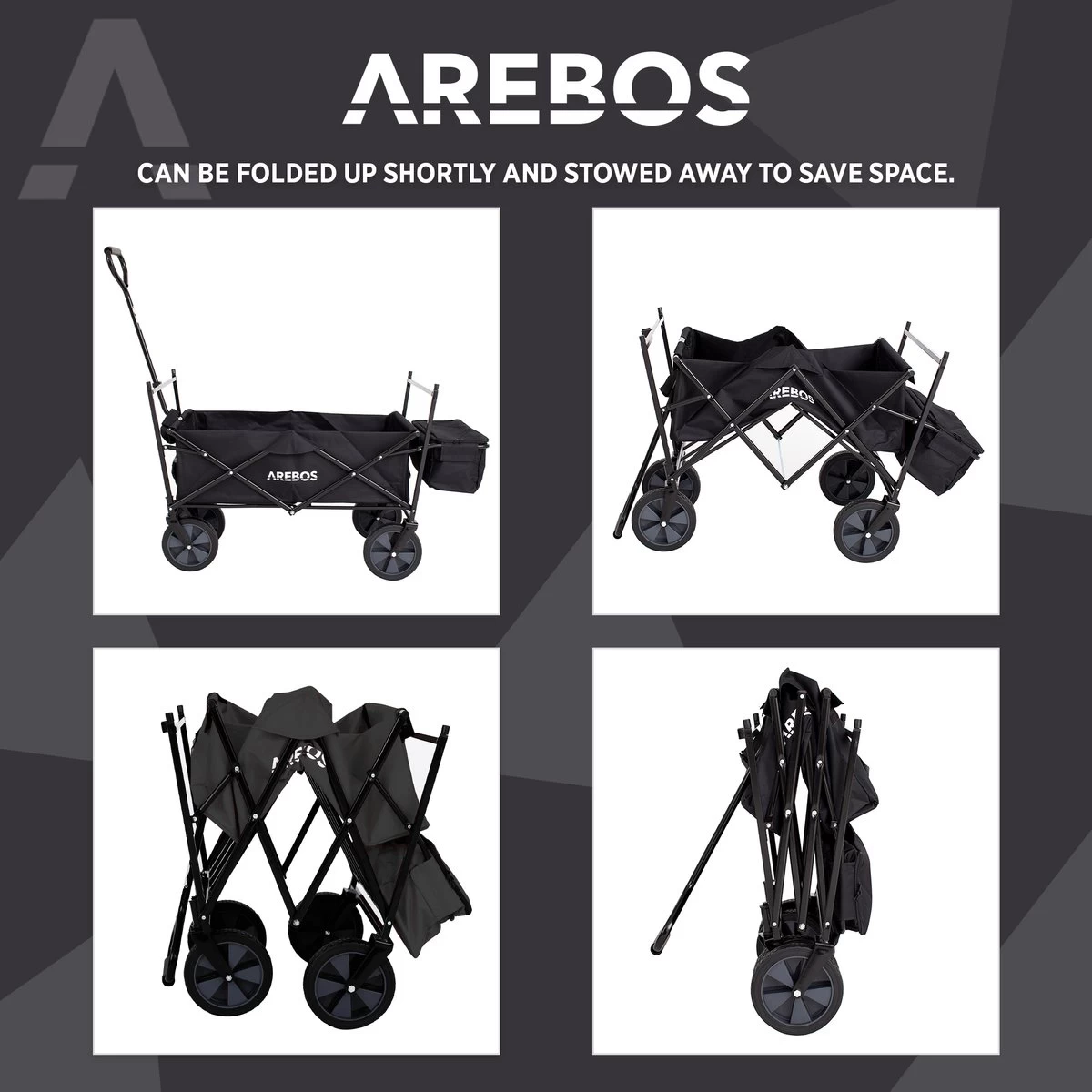[FUN] De duurzame nylon stof en stevige frameconstructie bieden een maximaal draagvermogen tot 70 kg. De AREBOSBollerwagen biedt dus voldoende ruimte voor uitstapjes met de kinderen, festivals of andere vrijetijdsactiviteiten.