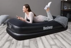 Een speciale I-balkconstructie van TriTech-materiaal geeft dit luchtbed extra stevigheid. Deze TriTech-balken zijn gemaakt van polyestergaas en met duurzaam PVC omhuld. Deze 3-laags constructie zorgt dat het bed zijn vorm behoudt, waardoor het de hele nacht stevig blijft en lang meegaat. Het zwarte luchtbed voor 1 persoon meet 191 bij 97 centimeter en is extra dik met een hoogte van 46 centimeter. Het bed kan een gewicht dragen tot maximaal 150 kilogram. Het heeft een geflockte bovenkant, waardoor de bovenlaag fluweelzacht aanvoelt en extra comfort biedt. Het slaapoppervlak heeft bovendien een antibacteriële behandeling gehad. In het onwaarschijnlijke geval van een gaatje, kun je de meegeleverde reparatiepatch gebruiken om het luchtbed te plakken.
