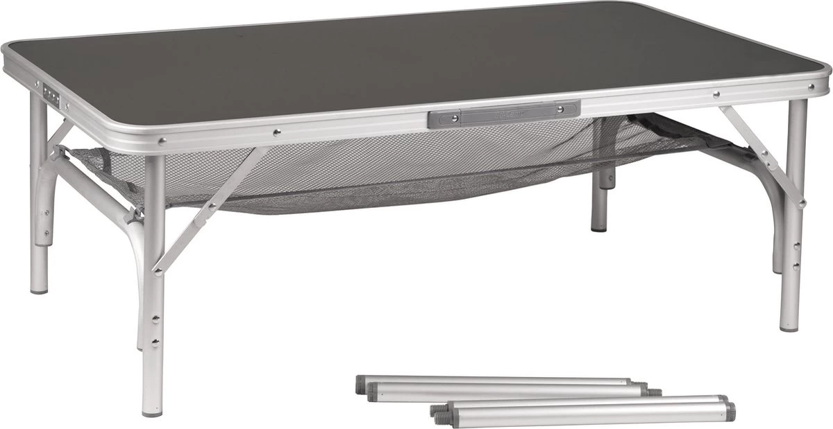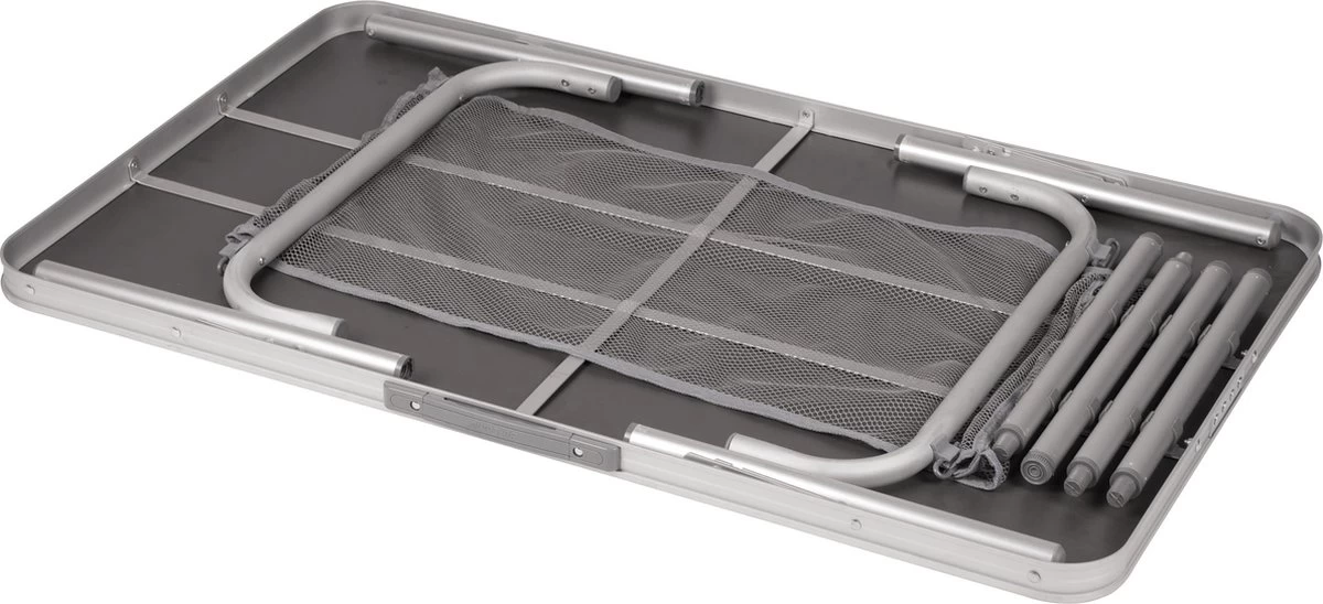 Een uiterst stabiele campingtafel. Deze tafel heeft afneembare poten en is hierdoor eenvoudig en compact in te klappen. Gemaakt van lichtgewicht aluminium. De poten zijn in hoogte verstelbaar (36/70 cm) en hebben stelschroeven voor de fijnafstelling. Onder het tafelblad is een net bevestigd om spullen op te bergen. Ingeklapt (lxbxh): 100x60x3,5 centimeter.