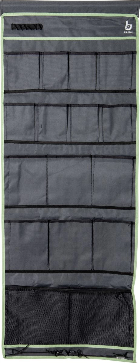 Een luxe multifunctionele organizer met 16 opbergvakken. Gemaakt van een hoge kwaliteit Two-Tone 600D Oxford Polyester voor een extra lange levensduur. Beschikt over 2 ruime vakken, 6 medium vakken en 8 kleine vakken. Eenvoudig en op diverse manieren te bevestigen. Zo kan dit tentschort met de pees worden opgehangen aan een caravanrails, met het klittenband aan een tentstok of met de zeilogen aan haken. De lussen onderaan zorgen voor extra fixatie.