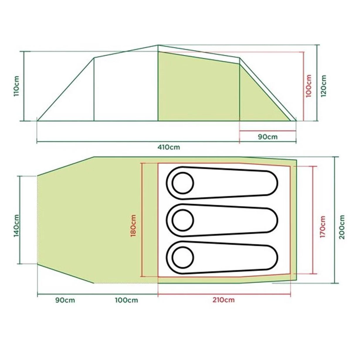 Deze 3 persoons tent biedt genoeg ruimte voor een gezin of vriendengroep. De tent heeft een ruim slaapgedeelte en een royale voortent om alle kampeerspullen op te bergen. Omdat de tent tevens een nok heeft, biedt dat extra hoofdruimte. Voor een makkelijke doorloop en goede ventilatie heeft de tent 2 ingangen.
