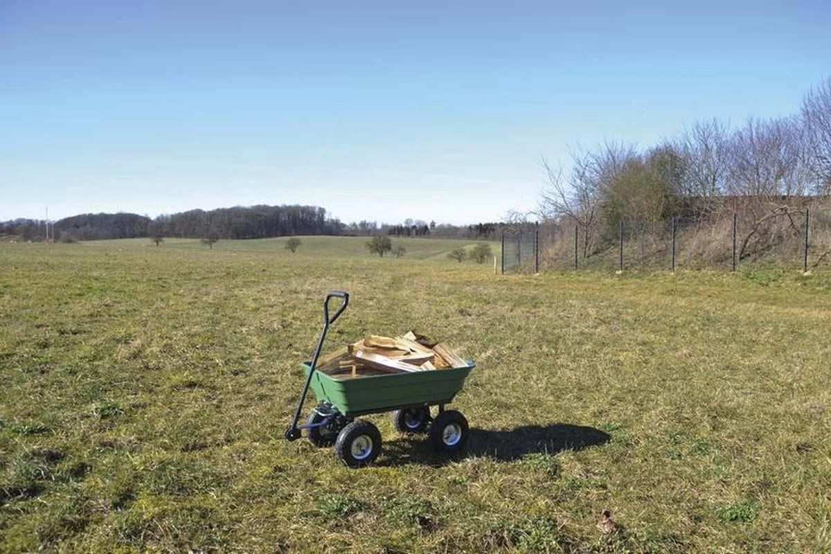 Zeer stabiele transportwagen met ruime kiepbak. De grote luchtbanden zorgen voor een gemakkelijke toegang zelfs tot oneffenheden in de ondergrond.