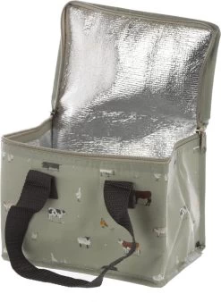 Handige grijze koeltas met boerderij dieren print om uw lunch of six-pack blikjes koel te houden. Afmetingen: 16 x 21 x 14 cm. Inhoud ca. 4,7 liter. Materiaal: polypropyleen.