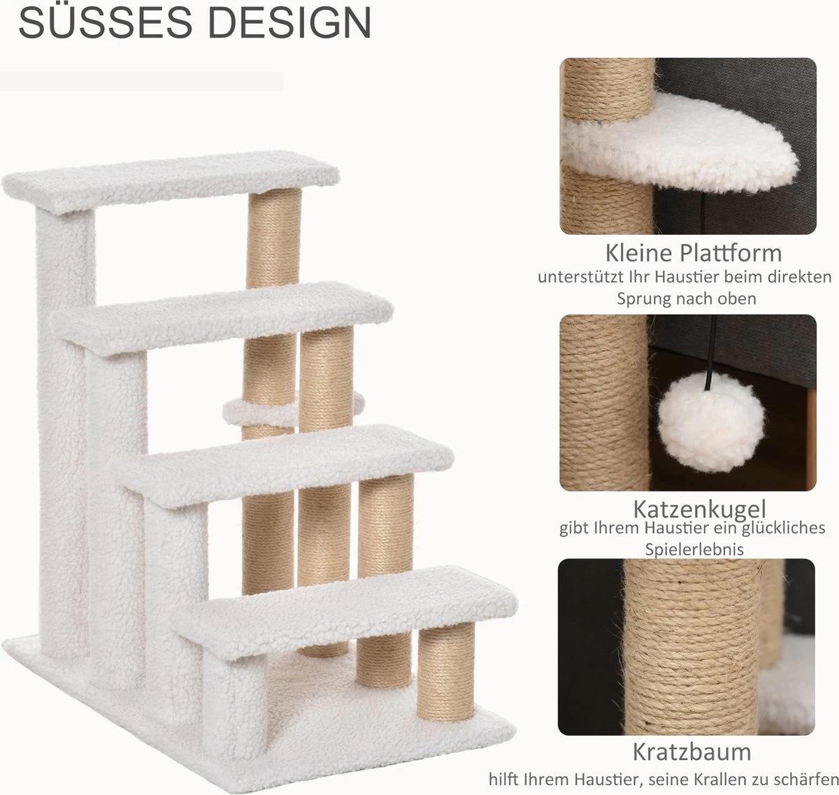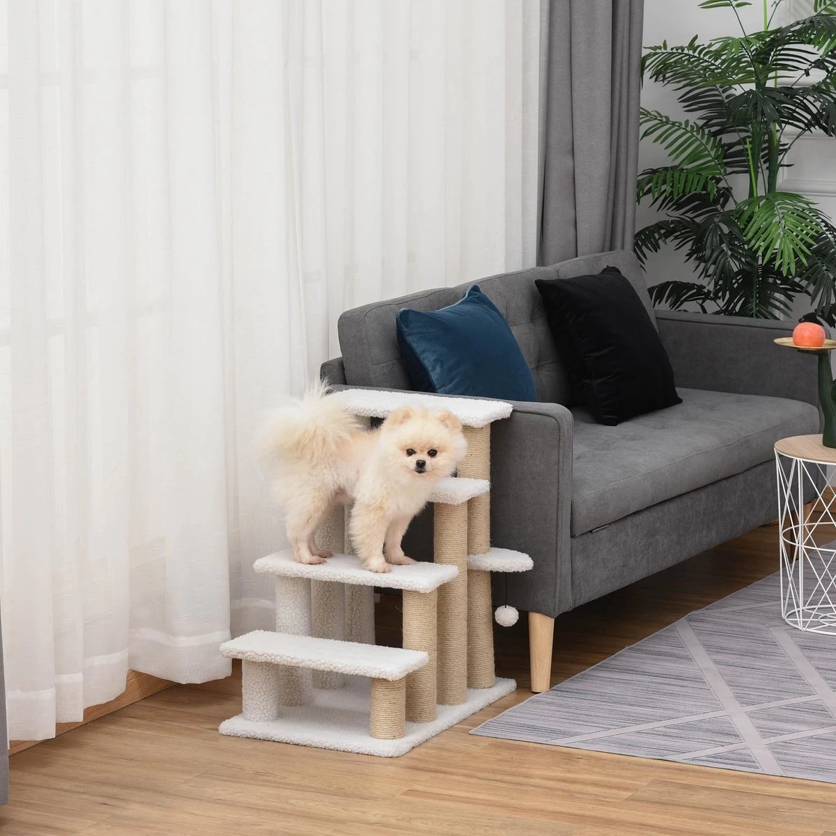 PawHut Huisdierentrap Met Krabpaal Bal 4 Treden Kattentrap Dierentrap Pluche Jute D06-093