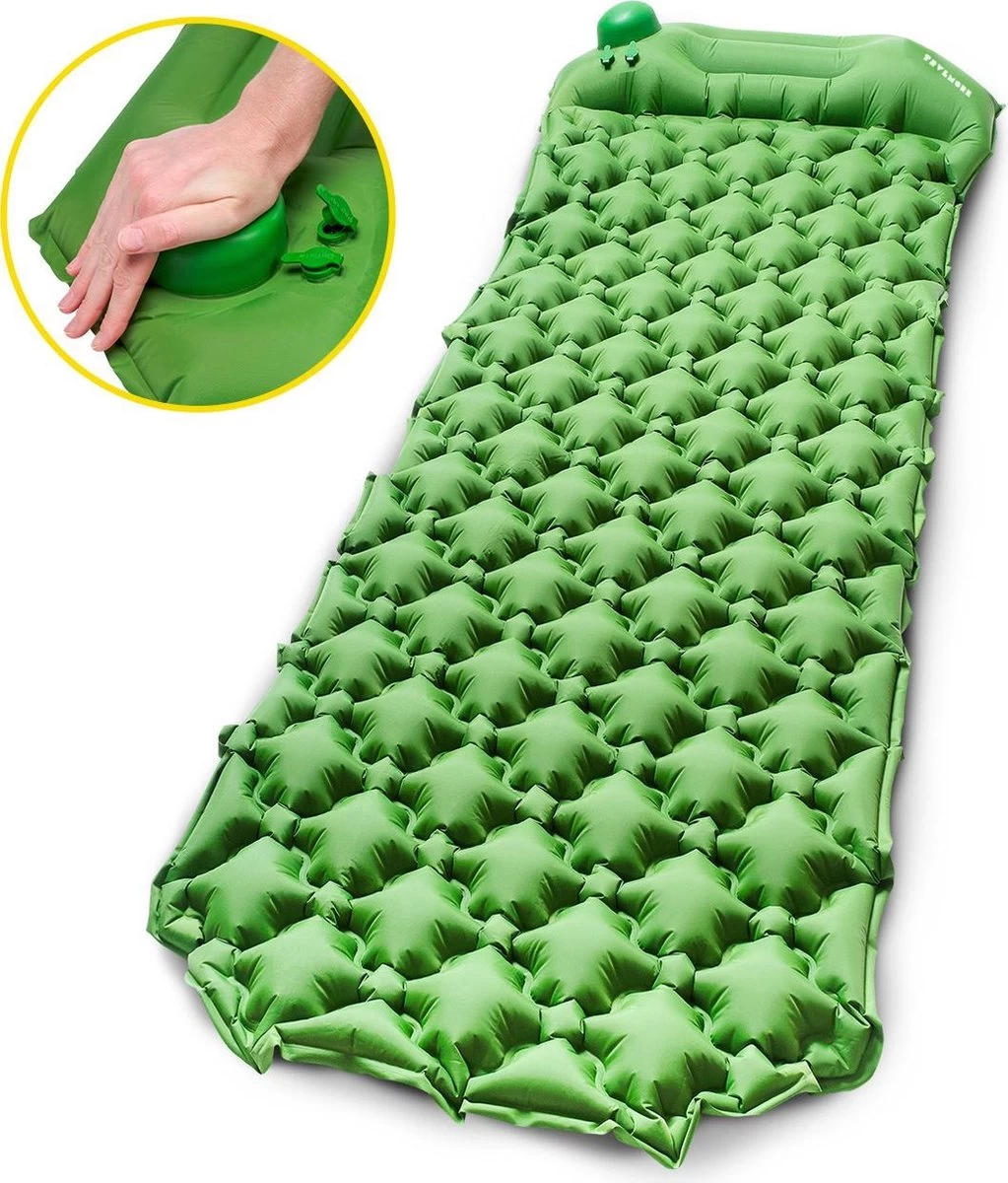 Een comfortabel en compact slaapmatje die makkelijk in je rugzak past? Blaas de TRVLMORE slaapmat in 2 minuten op met de geïntegreerde voetpomp en kruip in bed! Heerlijk comfortabel en gemaakt van zacht en stevig 40D nylon. De slaapmat is 6 cm dik en is afgewerkt met een vochtbestendige TPU coating. Het hoofdkussen heeft een ideale hoogte voor je nek. Het honingraat ontwerp houdt je lichaamswarmte goed vast. Zo kun je er de volgende dag weer helemaal tegenaan!